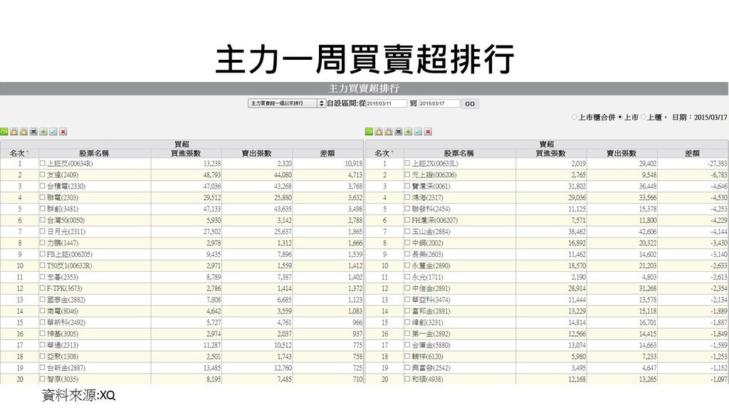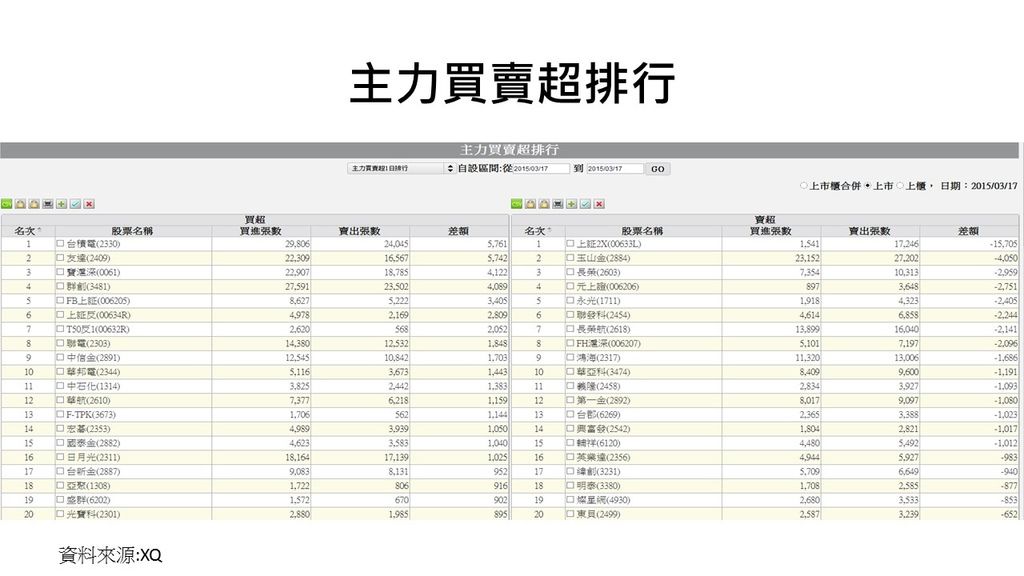 事不宜遲,說做就做,K馬上從「熱門股券商進出表」和「融資融券餘額表」研究起。所謂「熱門股券商進出表」是股票軟體上計算券商大單的進出,也稱為「主力買賣超」(如附圖一),主力的定義是當天買賣超(買進張數-賣出張數)個股的前15名券商(一般並未計入自營商部份),而計算期間(天、周、月)所有進場的券商大單買進或賣出的股票總和統計就做出排行。大單定義各家有所不同,因此軟體統計結果多少會有不同,但是,都是可以參考的方向。